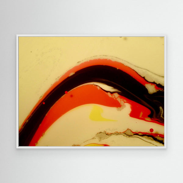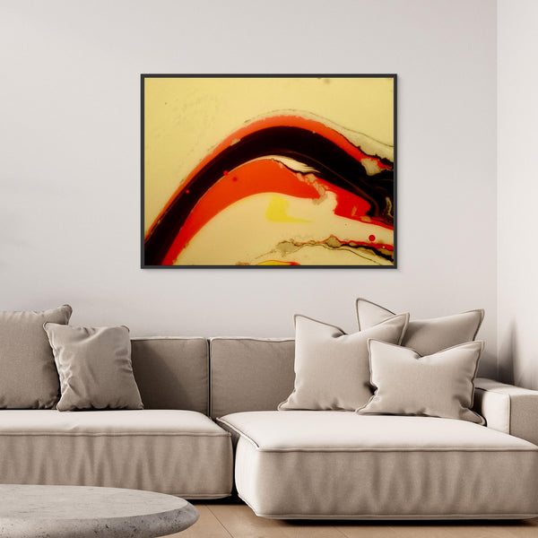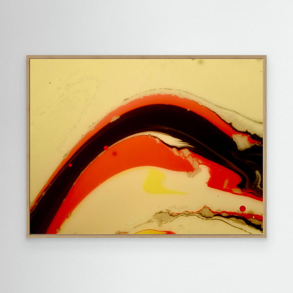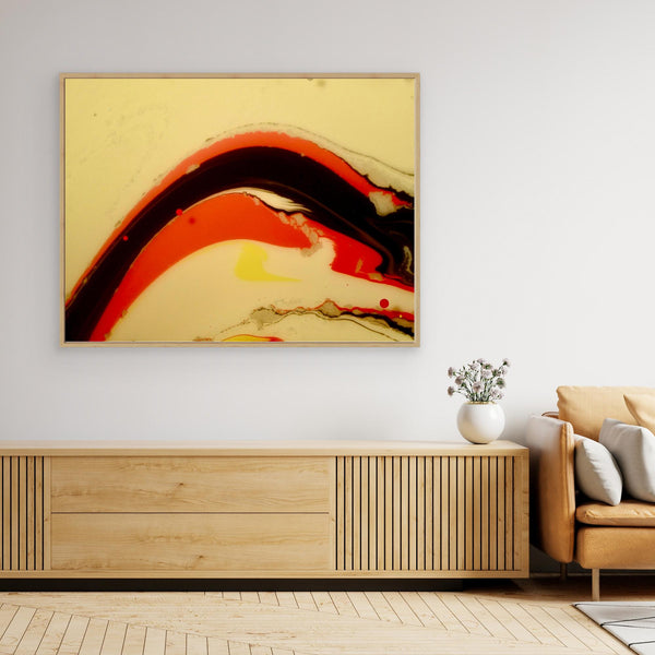 This composition channels the force of a slow-burning wave, arcing across the canvas with brooding drama. Thick bands of black and red curve in a fluid sweep, edged with delicate breaks and smudges that hint at erosion or disintegration. A pale lemon-yellow shape floats softly beneath, like a forgotten sun or ghost of energy. The simplicity of the palette intensifies the movement—this is fluidity as force, both natural and unnervingly precise. A moment of tension held mid-surge.