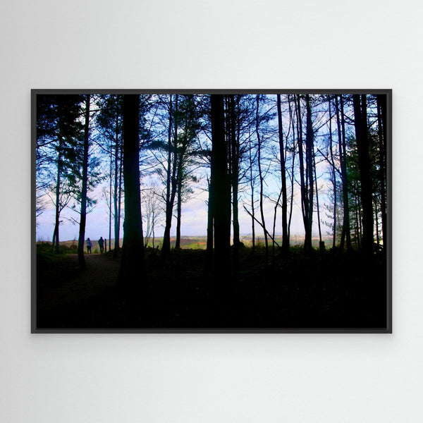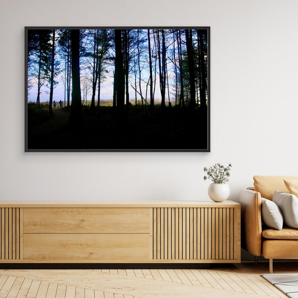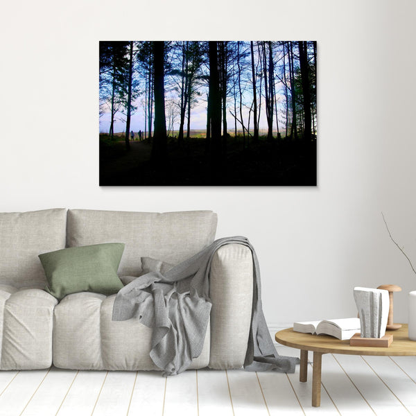 This image captures a striking contrast between the deep shadows of the forest and the open, light-filled view beyond. The silhouettes of two figures walking toward the horizon add a sense of narrative and quiet companionship.